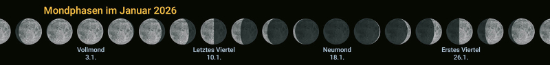 Venus erreicht am 6. Januar ihre obere Konjunktion mit der Sonne und ist im Januar nur am Taghimmel vertreten.