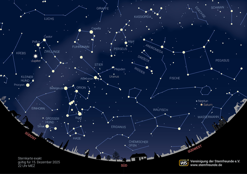 Jupiter in den Zwillingen strebt auf seine Oppositionsstellung zu, die er aber erst am 10. Januar 2026 erreichen wird. Trotzdem ist der größte Planet des Sonnensystems im Dezember optimal zu beobachten. Am 7.12. wandert der abnehmende Mond an Jupiter vorbei.